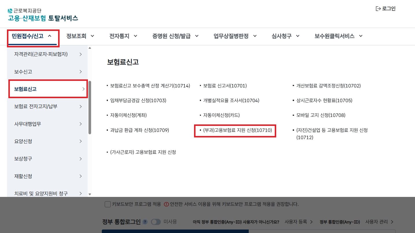 - (온라인) 근로복지공단 ‘고용·산재보험 토탈서비스’(total.comwel.or.kr) 접속 – 로그인 – 상단의 ‘민원접수/신고’ 클릭 – 좌측 ‘자영업자 고용보험 가입신청’ 클릭