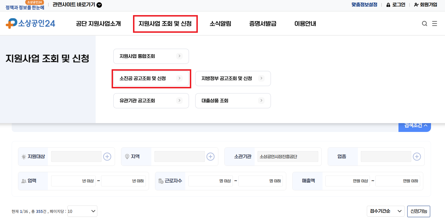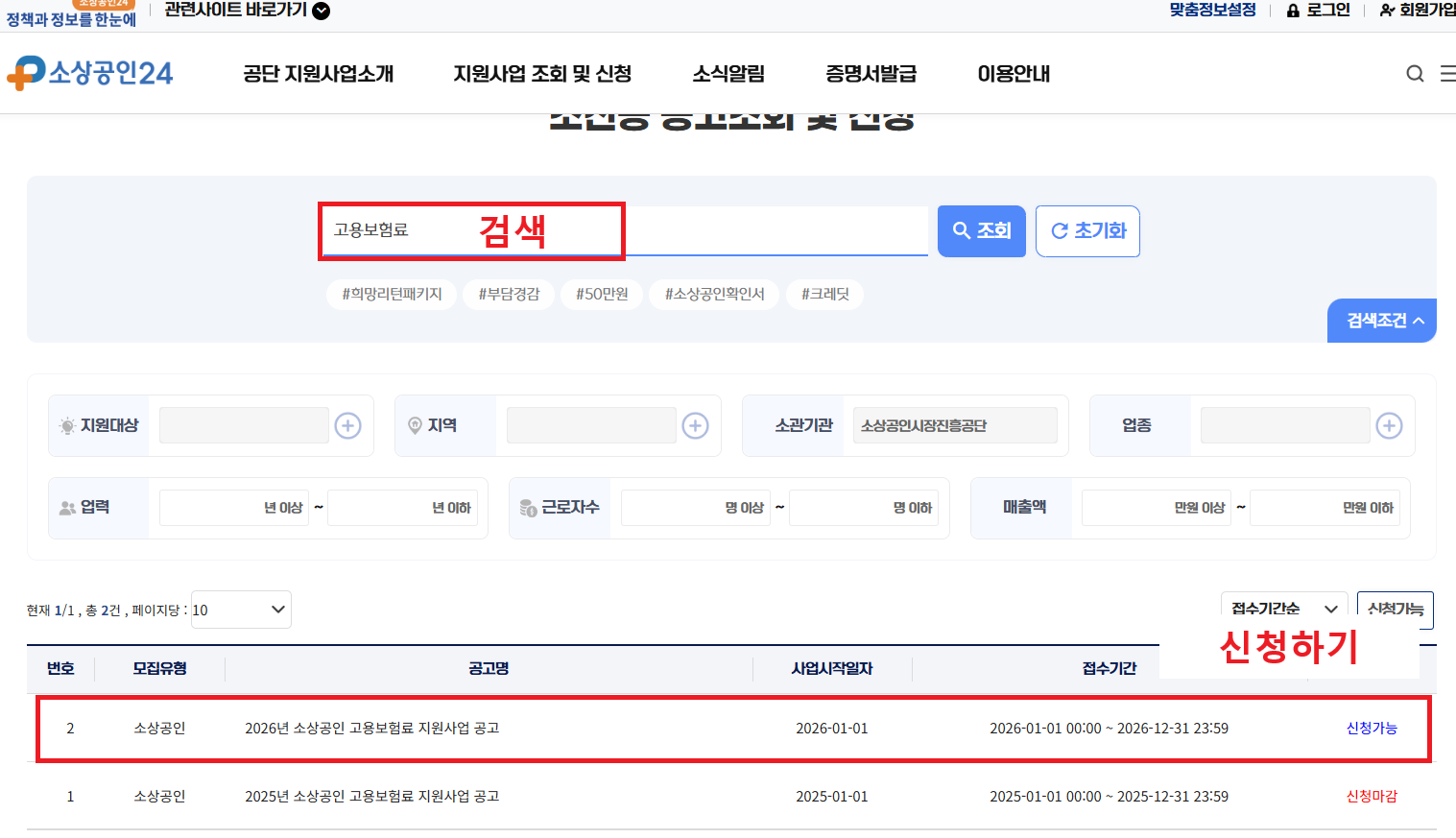- (온라인) ‘소상공인24’(sbiz24.kr) 접속 – 로그인- 상단 ‘지원사업신청’ 선택 – ‘소진공 공고 조회’ 선택 – ‘고용보험료 지원’ 검색 – ‘2026년 소상공인 고용보험료 지원사업’ 클릭 (※ 온라인 신청만 가능)