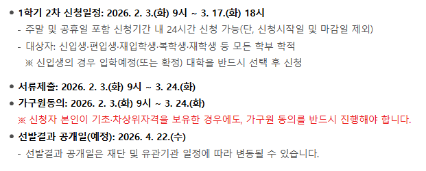 신청 완료, 가구원 동의, 서류 제출까지 정확히 마무리해야 지급이 가능합니다. 정확한 공지와 변경 사항은 한국장학재단 공식 안내를 통해 확인하는 것이 가장 안전합니다.